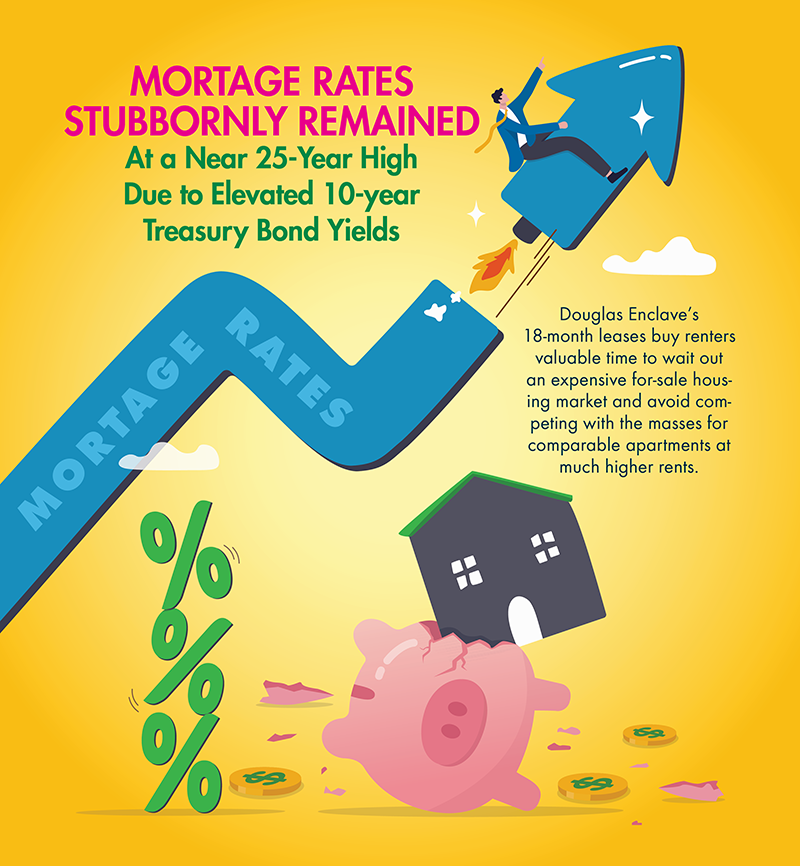 “Elevated mortgage rates are likely to persist, while aspiring homebuyers also face a shortage of affordable properties,” the report states. “Home prices remain near record highs, while higher borrowing costs add to the cost of financing a home.” Fortunately, there is a brand-new Miami apartment building offering 18-month leases on select available units. Douglas Enclave’s 18-month leases buy renters valuable time to wait out an expensive for-sale housing market and avoid competing with the masses for comparable apartments at much higher rents.